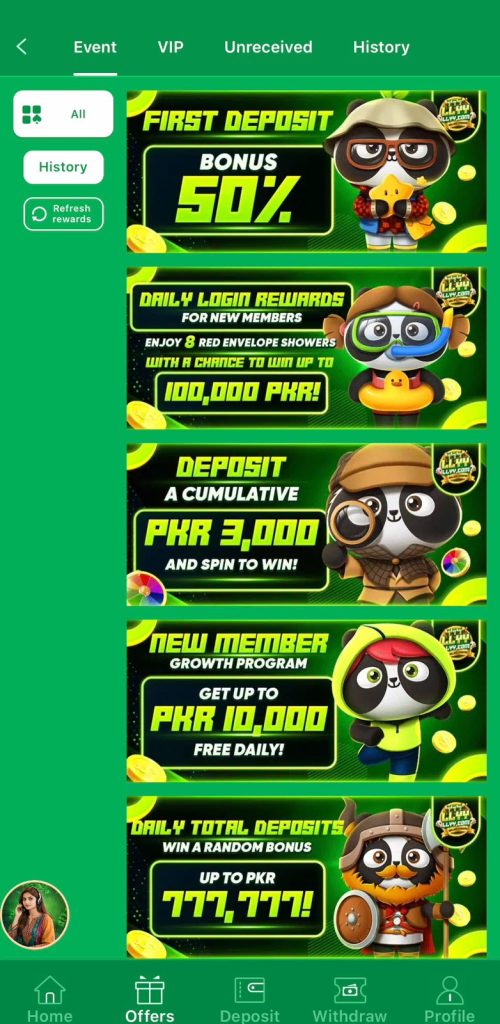 New users receive a welcome bonus, and existing users enjoy daily check-in rewards, free spins, and special event prizes.
